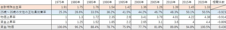 この表はあらゆる統計データから私が作成したものなのですが、1975年から2020年に至るまで、5年ごとの合計特殊出生率、25歳~35歳の女性の正社員就業率、物価上昇指数、賃金上昇指数を表にしたものです。右の相関係数は、合計特殊出生率と各データとの相関係数を取っております。