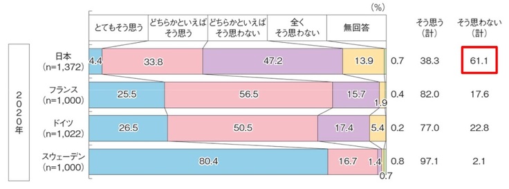 まず、自国は子どもを産み育てやすいかという問いに対して、各国国民は以下の通り回答いたしております。