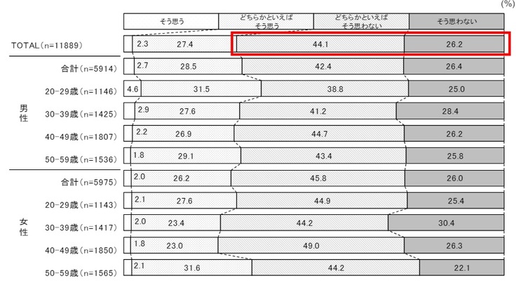 一方で、日本が結婚、妊娠、子ども・子育てに温かい社会ニッ向かっているかについて問うたところ、およそ7割が向かっているとは思えないと回答いたしております。