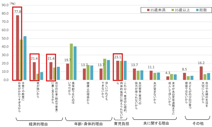 また、理想の子どもの数を持たない理由で圧倒的に多かったのは、子育てや教育にお金がかかりすぎるから、という理由が8割近くに上り、2割台の理由で、これ以上育児の心理的・肉体的負担に耐えられないから、自分の仕事(勤めや家業)に差し支えるから、家が狭いから、といった理由が並びます。