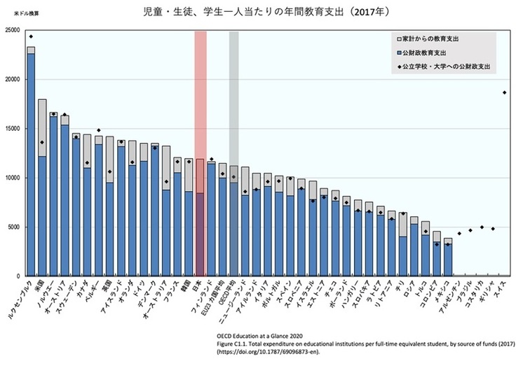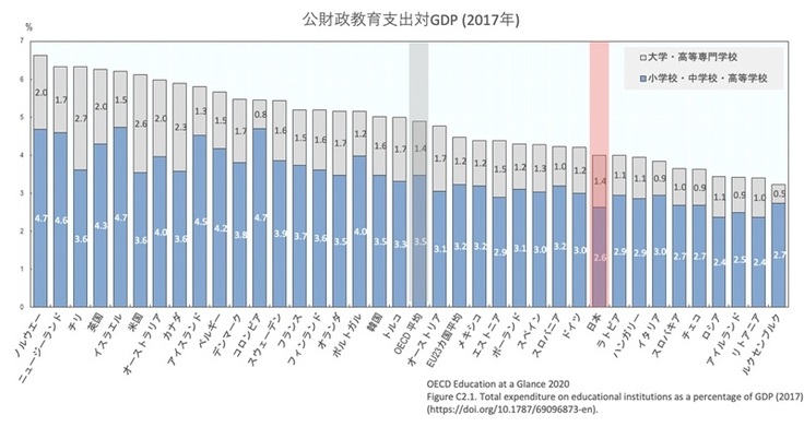このグラフから見てわかる通り、日本はあまり公財政教育支出を出しておりません。つまり、行政はあまり教育にお金をかけているわけではありません。