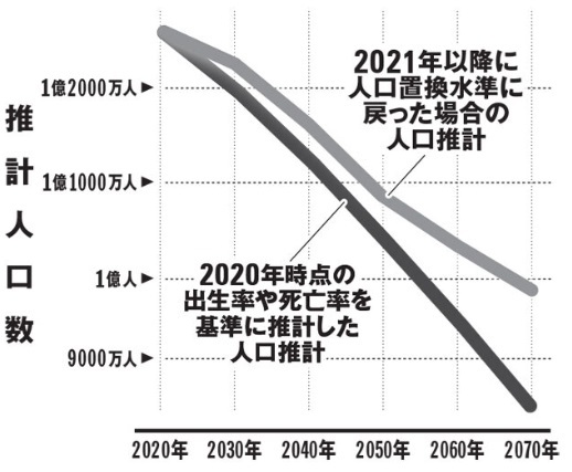 一方で、仮に結婚支援、子育て支援もうまくいった、合計特殊出生率も人口置換の2.07と奇跡的になった、と仮定しても、実は向こう半世紀以上、人口が減り続けていくことは統計上決定しております。