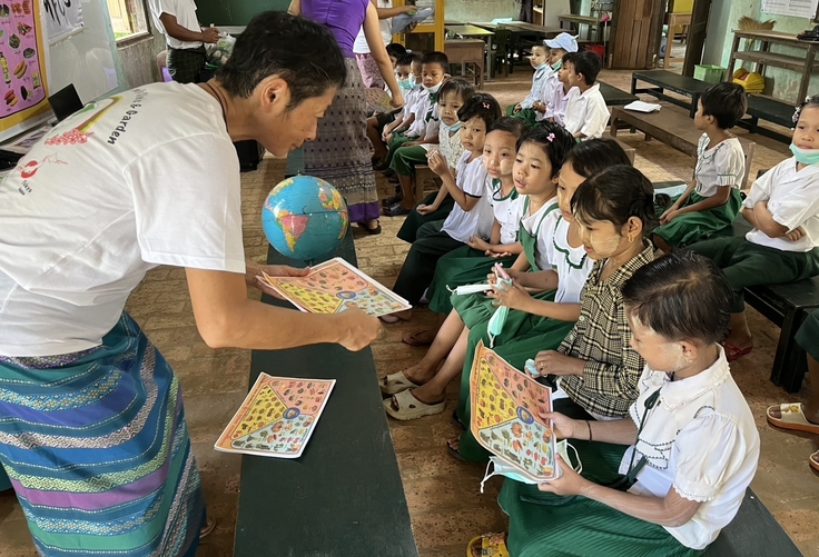 MFCG 代表の名知仁子や現地のミャンマー人メンバーが学校を訪問し、ゲームも交えて、栄養についての説明を行いました。