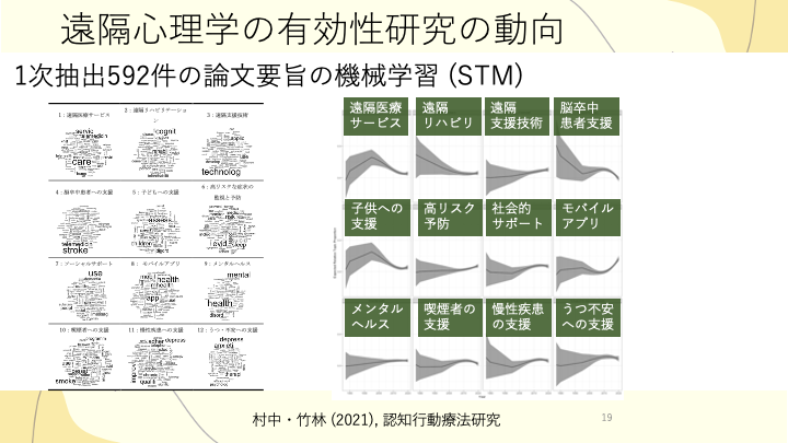我々の研究チームでは、遠隔心理支援の有効性を評価したレビュー論文を俯瞰的にレビューする研究を進めています。その一環として、レビューで収集した文献のアブストラクト(要約)に機械学習(トピックモデル)を適用し、この研究領域における研究動向を検討しました。この成果は、以下に公開されています。