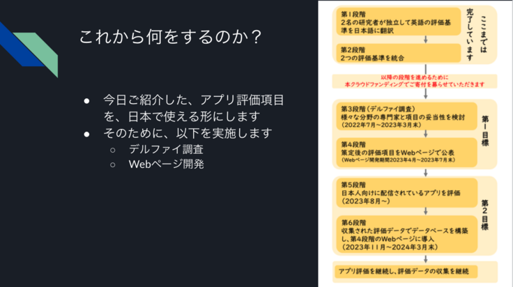 プロジェクトページにも記載していますが、私たちは、米国で公開されているメンタルヘルスアプリの評価項目を日本で使える形にして、日本で公開することを目指しています。