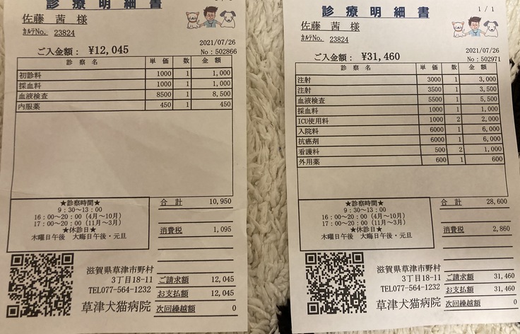 みーちゃんの治療費、主に点滴、ステロイド注射、血液検査、抗がん剤