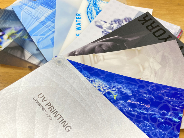 カラー印刷の上に、さらに透明な2種類のニス(ハジキニスと光沢ニス)を使って印刷します。