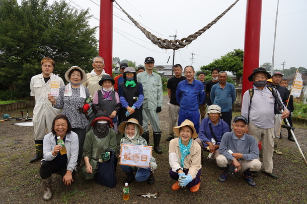 こちらはコノハナサクヤヒメの父・オオヤマツミノミコトを祭神とする石貫神社。石貫地区の皆さんと、伝承地の草刈り後の一枚!!