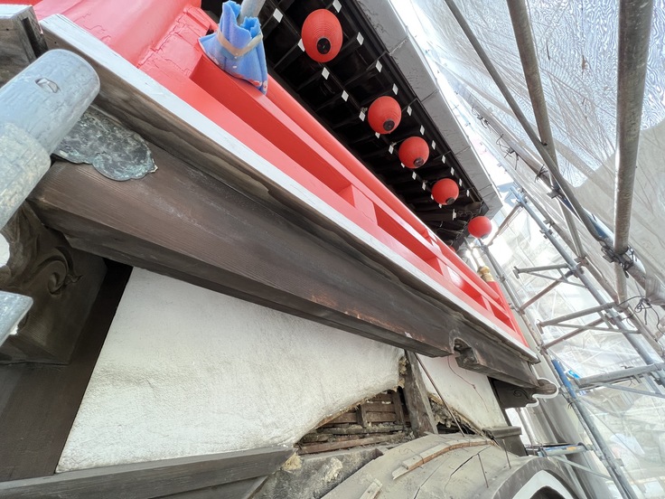 塗装工事は欄干や垂木の端などを塗装しております。特に欄干の塗装色については専門家や建築家の意見を踏まえて「紅緋色」にしております。