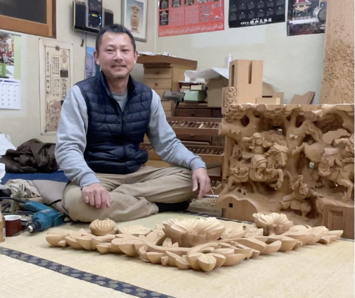 1968年生まれ。大阪府在住で、地車彫刻に魅せられ、18歳から老舗の木下彫刻工芸で木下賢治親方に師事し、2010年に独立。自身の工房「賢申堂」を設立。