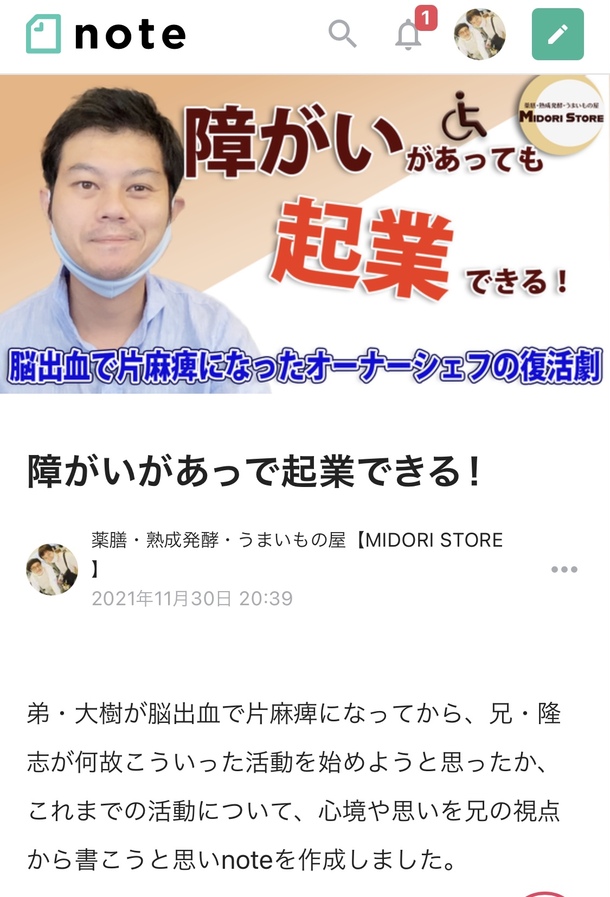 弟・大樹が脳出血で片麻痺になってから、兄・隆志が何故こういった活動を始めようと思ったか、これまでの活動について、心境や思いを兄の視点から書こうと思いnoteを作成しました。
