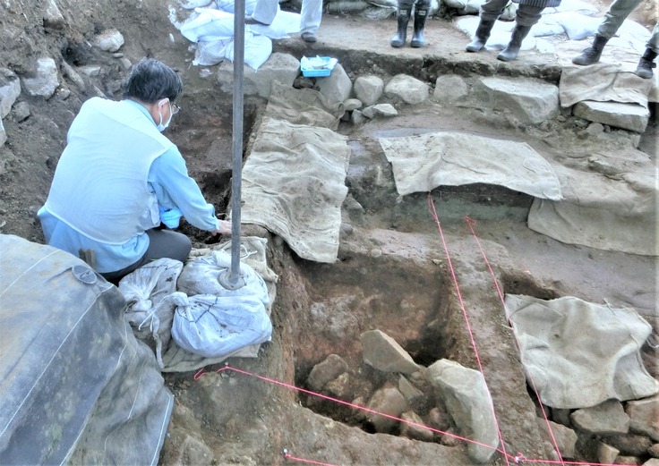 南側から撮影|田中裕介教授が示しているのは発掘作業を行っている墓壙の西側、裏山からの傾斜の境目の所です。建立当時の墓石の位置確認も、今回の調査の重要なポイントで、それの探索のための掘削状況を見ている所です。