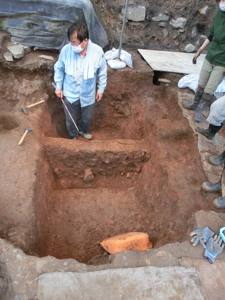昨日は大村市の園田市長、副市長、教育長などの皆様が視察にお見えになりました。作業は南北のベルトを残して東西の土層を掘り下げていきます。東側にサブトレンチを入れることにしました。2017年の第三次調査で出土した埋葬施設より深い印象で、作業も少人数しか入れなくなりました。