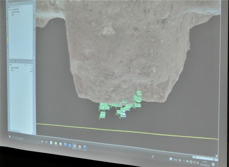 委員会での審議風景。現地視察の情報に加えて、これまでの発掘調査プロセスを3D画像を活用して説明しています。