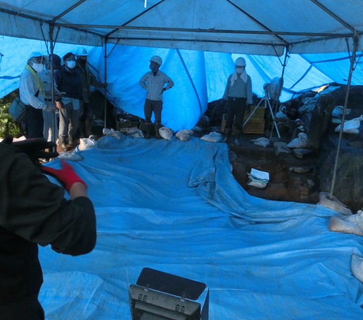 作業環境の整備を行いますが、風雨はさらに激しく、ブルーシートがはためき、雨が降り込み、水がしみ出してくるので、発掘作業と作業環境整備を並行します。毎回のことながら副代表の町田氏のご指示のもと、環境整備がてきぱきと進みました。昼前には雨も落ち着き、風も収まってきました。14日は出土したご遺骨の周囲を掘り下げて形状を明らかにするとともに、木棺跡と思われる範囲全体を掘り下げていきます。