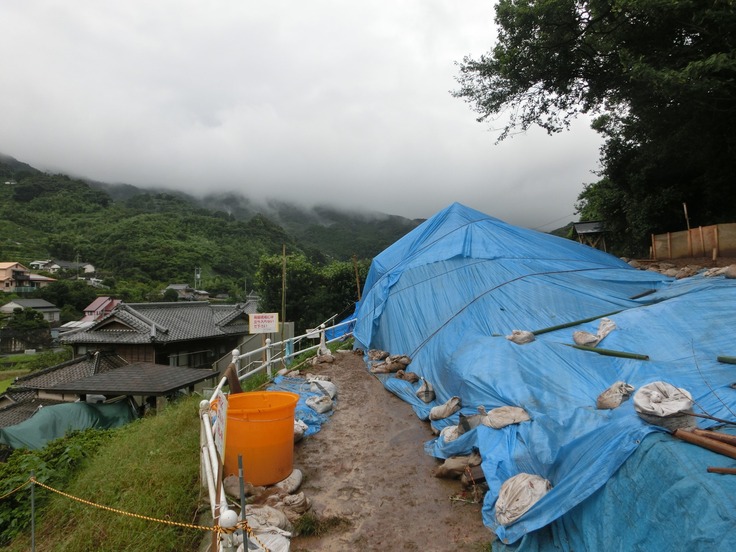 作業終業時の現場です。厳重な風雨対策が一目でわかる方と思います。町田副代表の指示でてきぱきと進みます。向かいの山には低い雲に覆われていますが、雨は止んでいます。