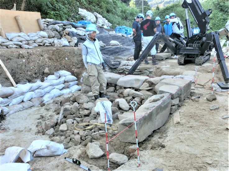 石の位置と高さは、最終的な墓所復元のため、慎重に確認しながら進めなければなりません。当然のことながら、埋め戻しの上に設置するのですから、その後の沈み込みも考慮して設置していきます。前回は発掘調査委託先の方が行いましたが、今回は石材のプロの方々が対応いただいています。