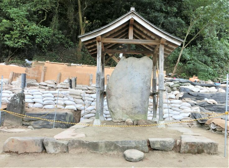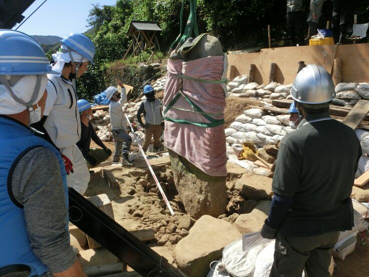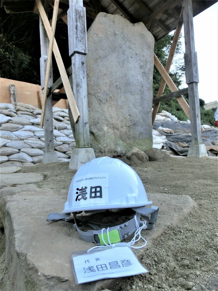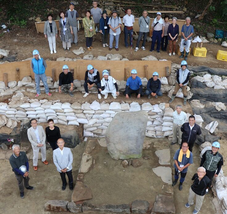これは復元作業完了時の写真です。後列にいらっしゃるのは2014年の第一次調査前からご支援を続けていただいてきた皆さま。特に2017年の第三次調査では、実行委員会を組織いただき、大変な成果を上げていただき、今回の第四次調査につなげていただいた方々が並んでいらっしゃいます。お一人ずつの方との想い出が次々と浮かび、語り尽くせません。この何倍もの方々のお顔が思い出されます。二列目は長崎県石材加工組合連合会青年部の皆さま。復元作業ながら、見た目の美しさも配慮した石組は、さすがプロの技です。手前の右端は青年部部長の松尾様。あとはプロジェクトメンバーの皆さまです。