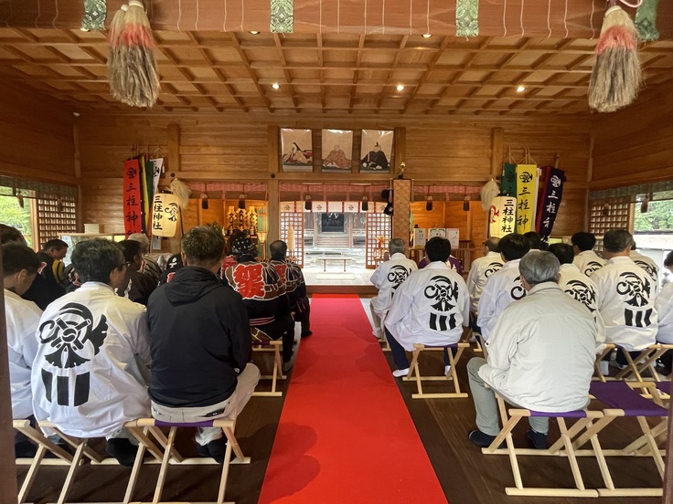 御神幸行列はあいにくの雨のため中止となりましたが、皆様にご支援をいただきました三柱神社の御神輿もお目見えいたしました。火災により消失してしまった御神輿。