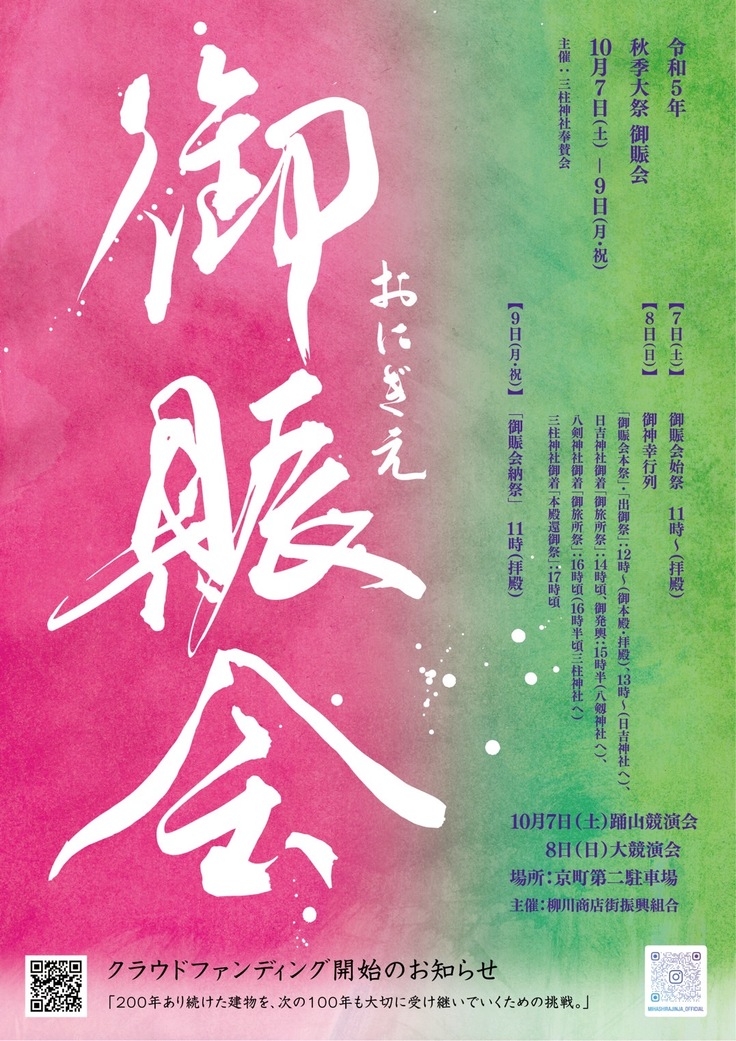 御賑会とは、初代柳川藩主の立花宗茂公と宗茂の妻 誾千代姫、そして岳父 戸次道雪公の三神を御祭神とする五穀豊穣に対する感謝祭であり、当社のお祭りの中で最も大切な神事です。