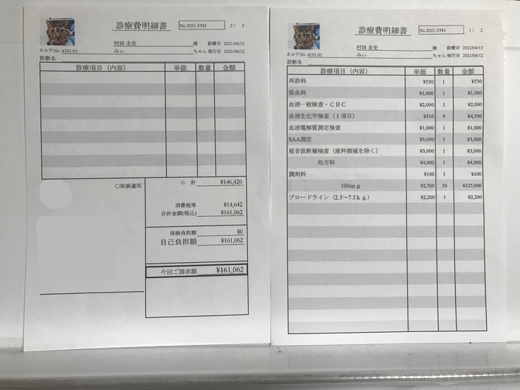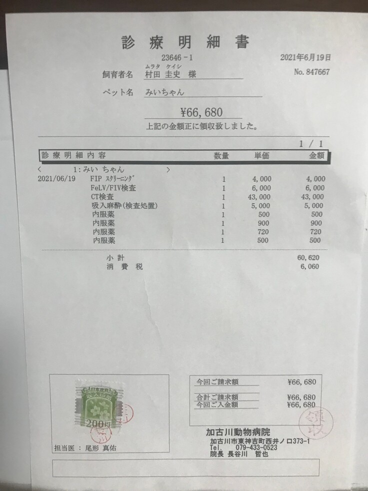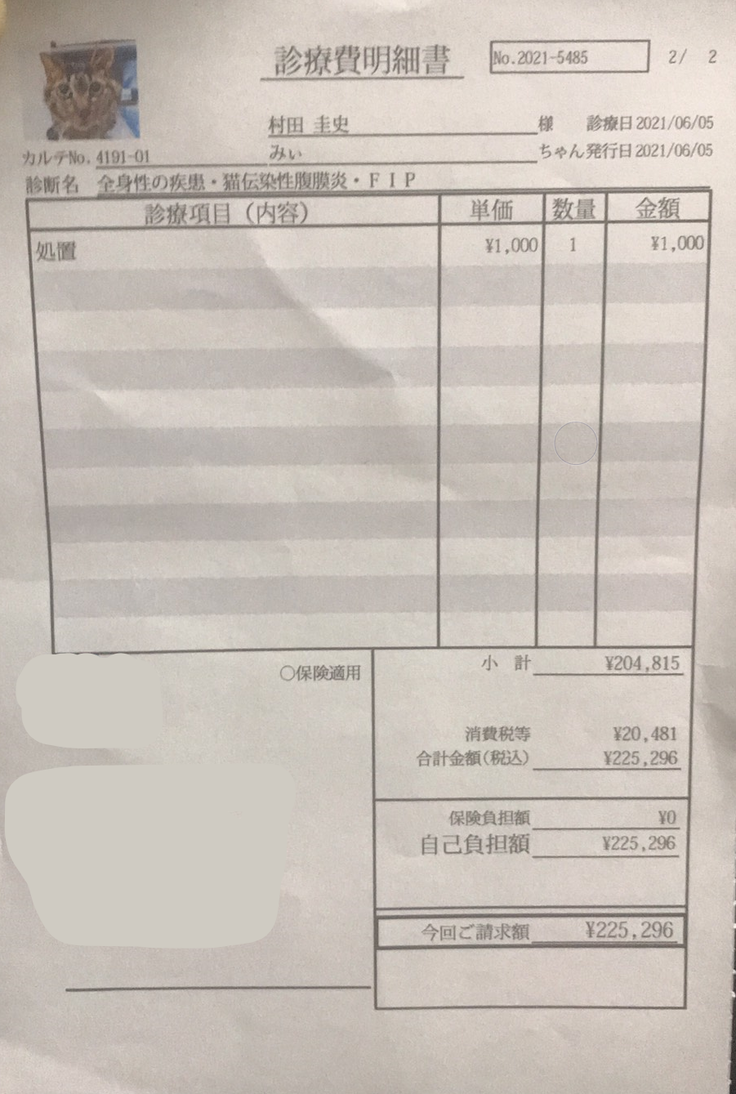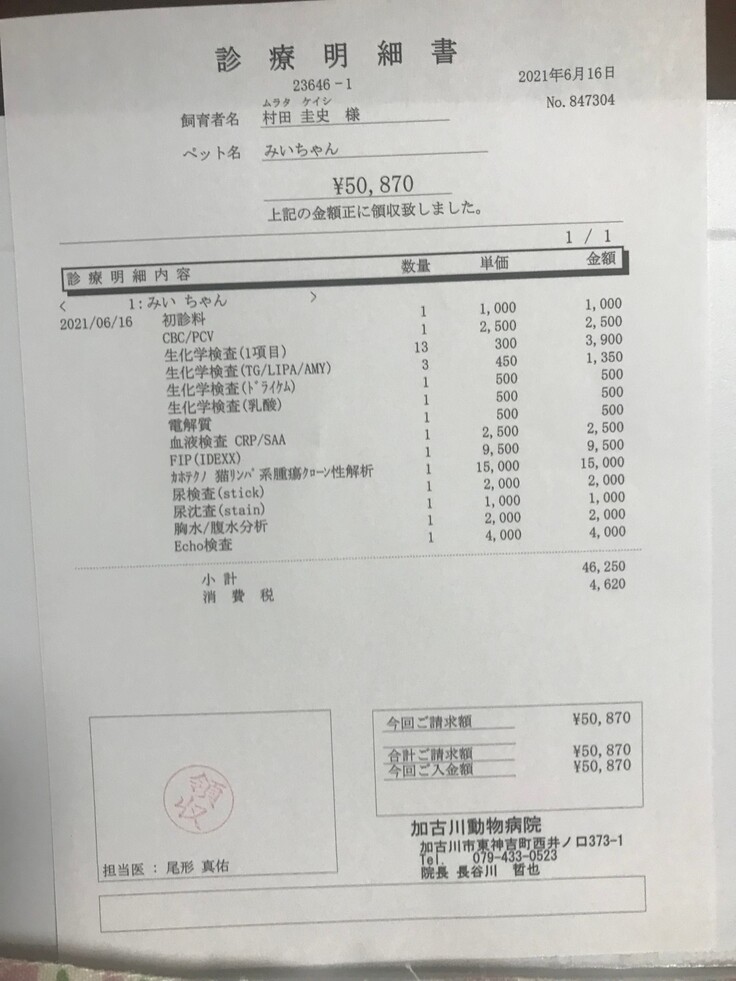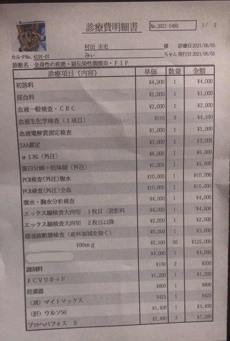 FIPの新薬をすでに30万円分投薬してしまったことや、今まで複数の検査費用が重なったこと、応急処置やその他の薬代、そしてこれからの手術代・検査費用などを考えると、最低でも計90万以上かかる予定です。
