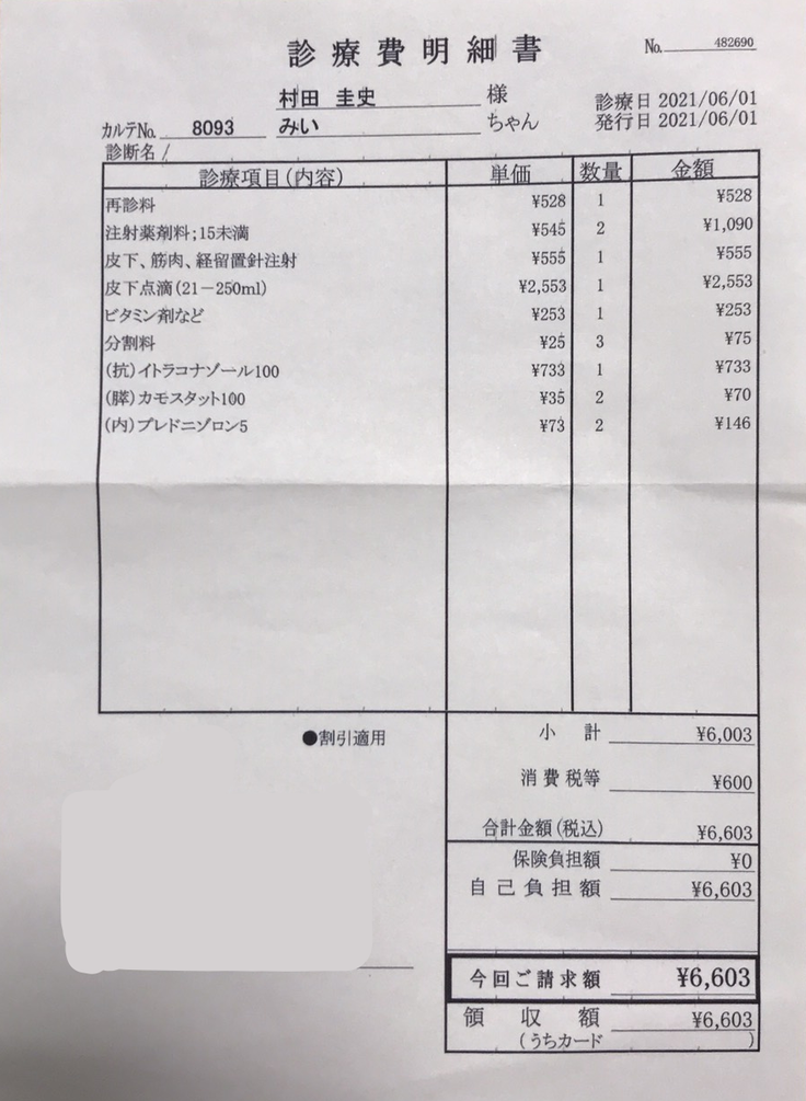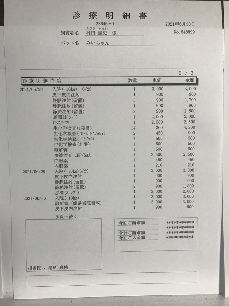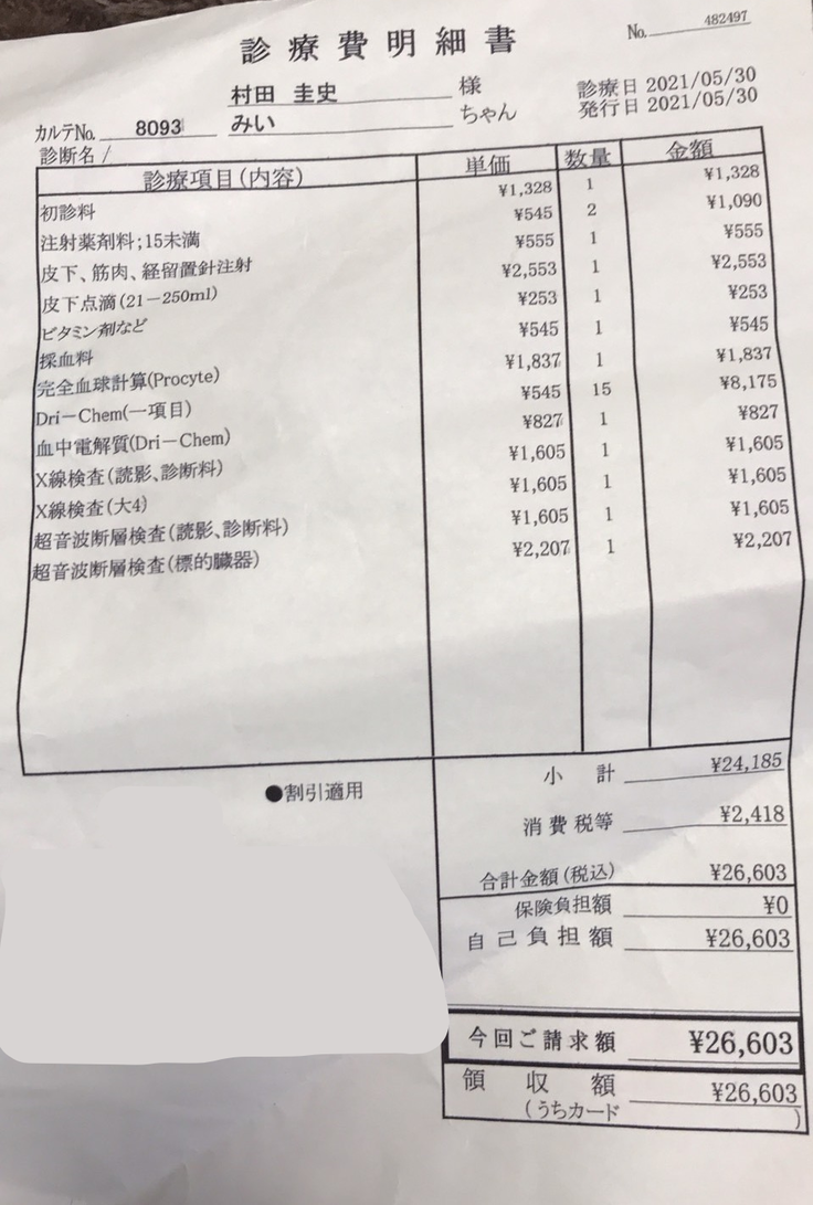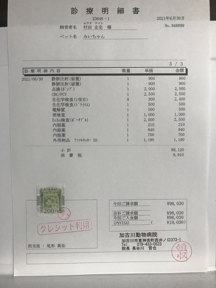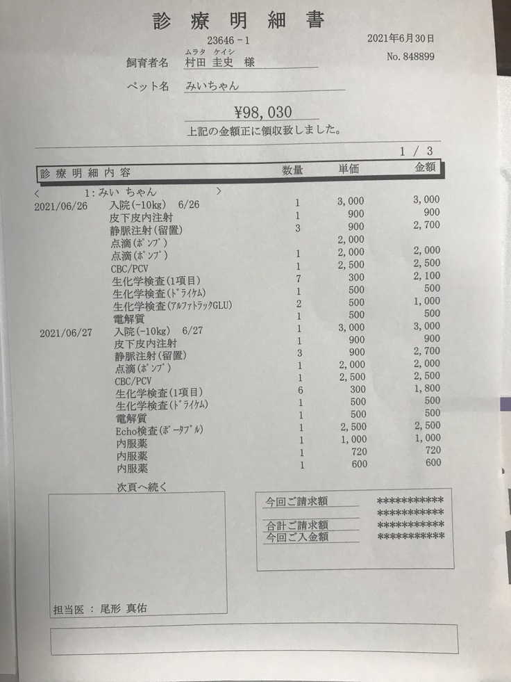 FIPの新薬をすでに30万円分投薬してしまったことや、今まで複数の検査費用が重なったこと、応急処置やその他の薬代、そしてこれからの手術代・検査費用などを考えると、最低でも計90万以上かかる予定です。