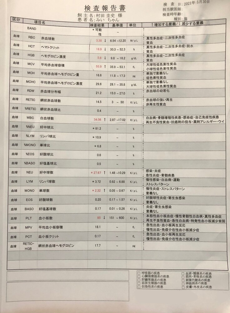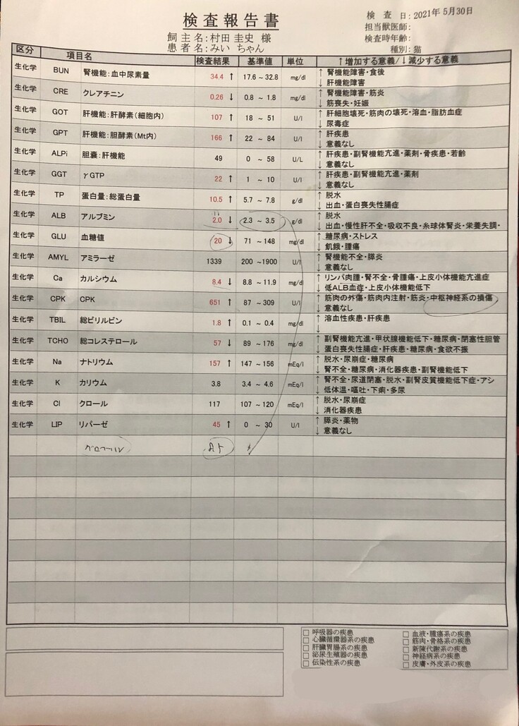 血液検査および尿検査を行い、その結果みいちゃんは「糖尿病性ケトアシドーシス」であると判明しました。