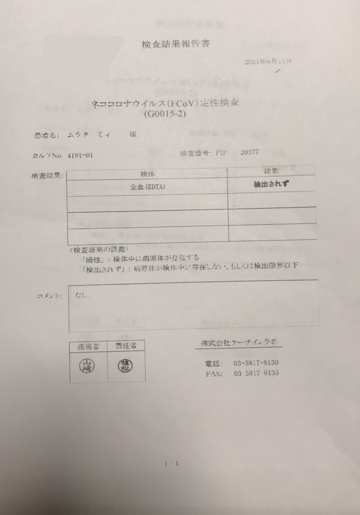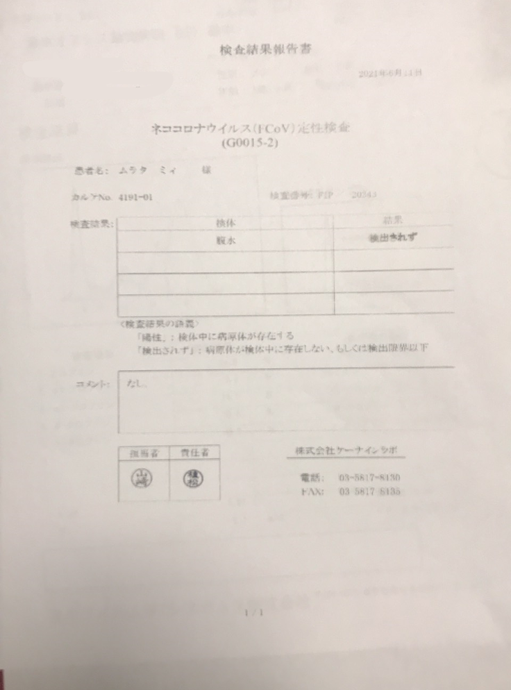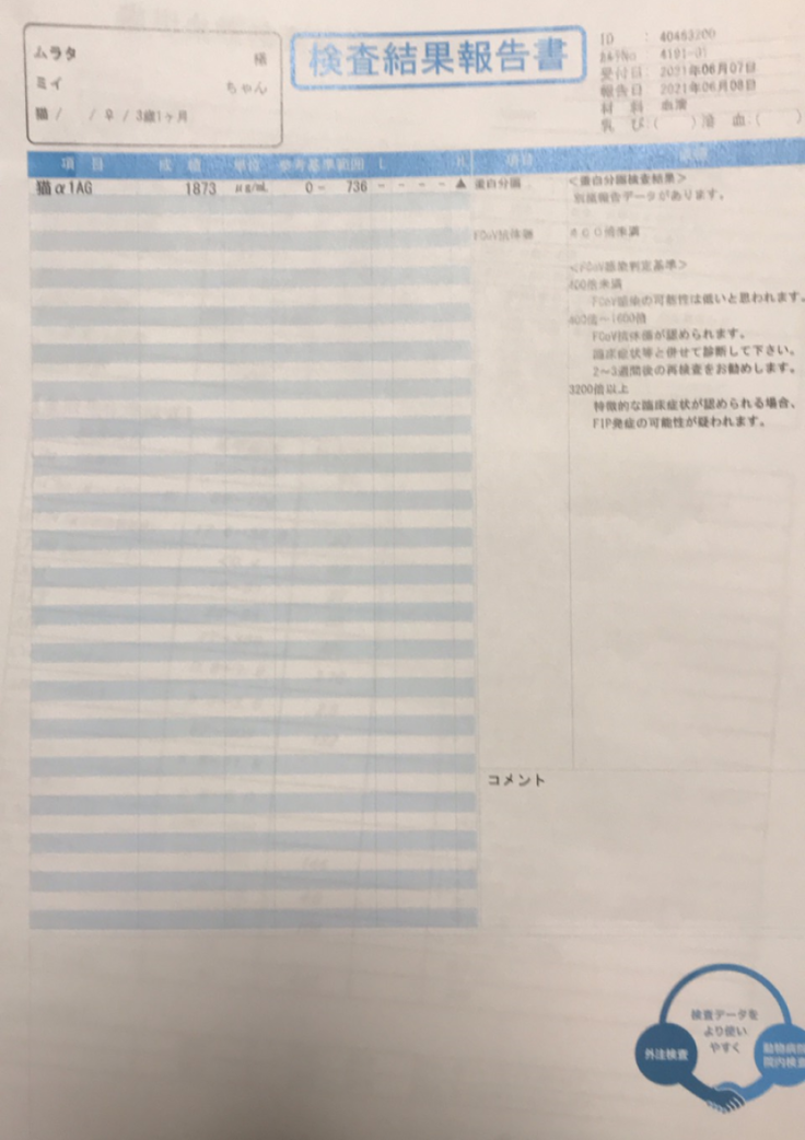 しかしその後、PCR検査の結果が出てくると、猫コロナウイルスの基準値が下回っており、FIPが陰性という結果になりました。