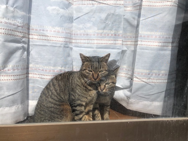 みいちゃんとまるくんのお気に入りの場所は大きな窓で、外の庭から眺めると2人仲良く揃ってお迎えに来てくれます。