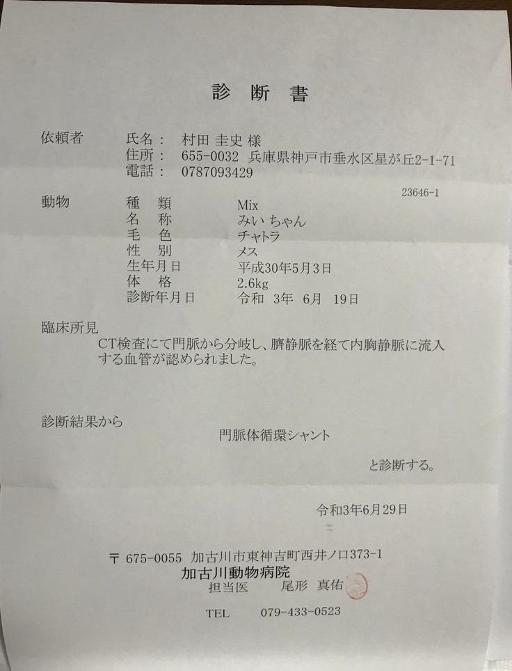 最初はFIP(猫伝染症腹膜炎)と診断され、投薬を開始しましたが、PCRの検査が陰性で、原因が分からず計4つの病院を転々としました。CT検査の結果、発症率2%のさらに稀な病気の門脈シャントと診断されました。