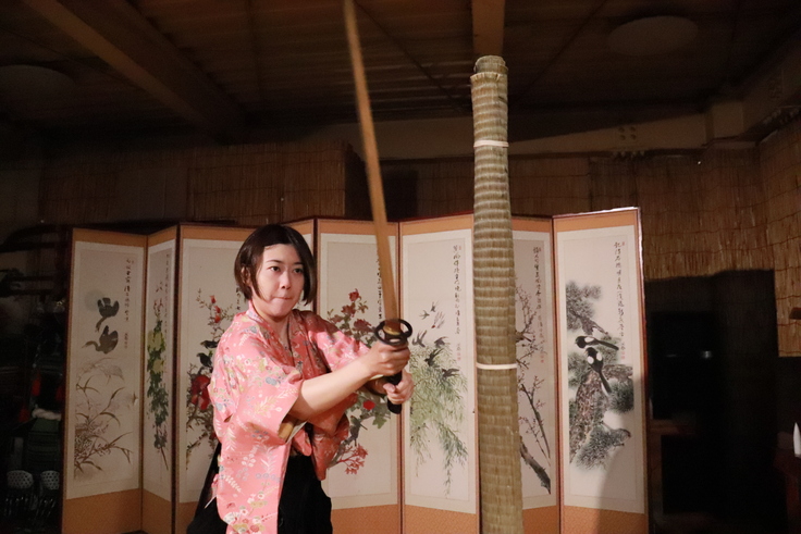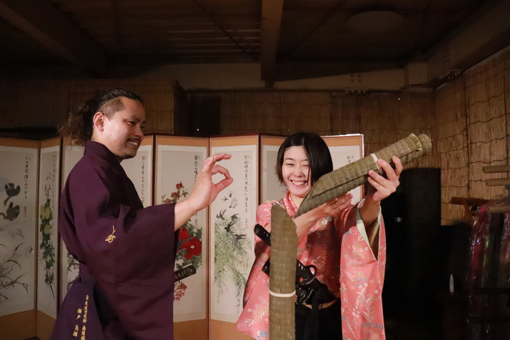 本プロジェクトでは、有段者指導のもと、1日体験入門という形で実際に斬れる日本刀を使用して畳巻きを斬る体験をしていただきます。 日常生活においては実際に刀に触れる機会はほぼ無いうえ、居合を始めるには模造刀や着物の購入などお金もかかりますし、時間がとれるのか、続けられるのかなど相当な決断が必要になるものと思います。 今回はその敷居を下げ、所要時間40分ほどの体験コースをご用意させていただきます。少しでもご興味をお持ちいただいた方はぜひこの機会に、京都へ1日体験にいらしてみてください。観光のついでにでもいい思い出になることを保証いたします! また門下生には女性も多く、ゲームやアニメがきっかけで入門された方も多くいらっしゃいます。もちろん入門も大歓迎です!