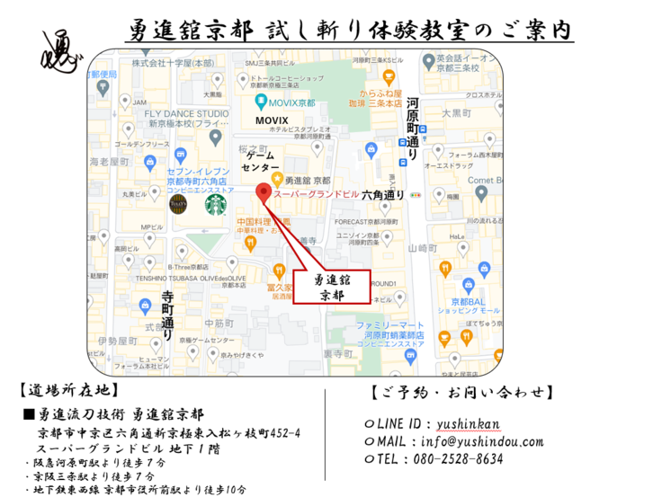 居合道場「勇進舘」がこの度京都の一等地、三条河原町に新たな常設道場を新設いたしました。京阪三条駅、阪急河原町駅からそれぞれ徒歩約7分の好立地!