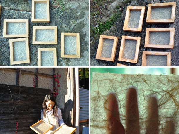 そして、この細かくなった繊維を山の天然水と混ぜ、木枠ですくい、太陽と風の自然の力のみで乾かします。機械は使わず、自然の気候と自分の力を信じて、1枚1枚紙を作ります。ここまでの作業は、あくまで印画紙、描く為の「キャンパス」を準備したまでにすぎません。
