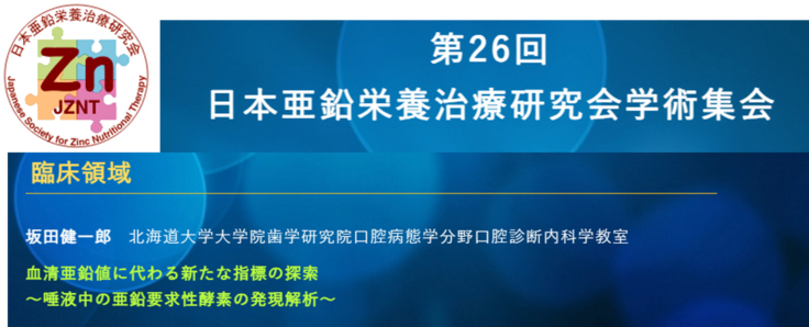 2023年8月26日(土)、新大阪にて第26回 日本亜鉛栄養治療研究会学術集会にて「血清亜鉛値に代わる新たな指標の探索 ~唾液中の亜鉛要求性酵素の発現解析~」
