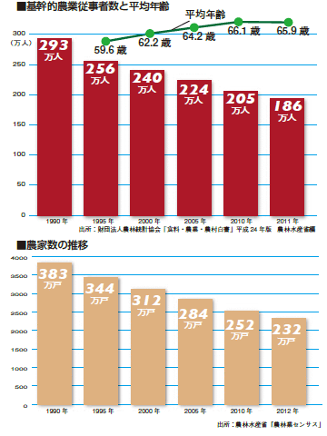農業就業人口のうち、基幹的農業従事者数(ふだんの仕事が主に農業)は、2010年は205万人でしたが、2011年には186万人と200万人を下回りました。グラフの通り農家戸数も減少の一途です。