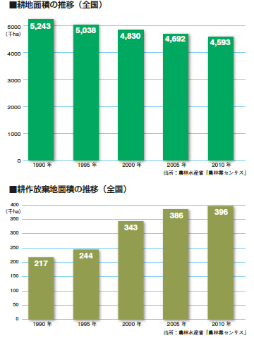 こちらも右肩上がりだからといって喜べるグラフではありません。なぜなら耕作放棄地の面積の上昇を示すグラフだからです(耕作放棄地の上昇とともに、当然耕作地の減少は右肩下がりとして示されます)。