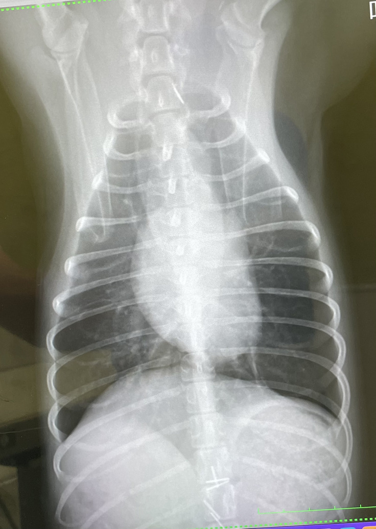 【最初のレントゲン】胸水で真っ白です。そのせいで肺の形までくっきり・・