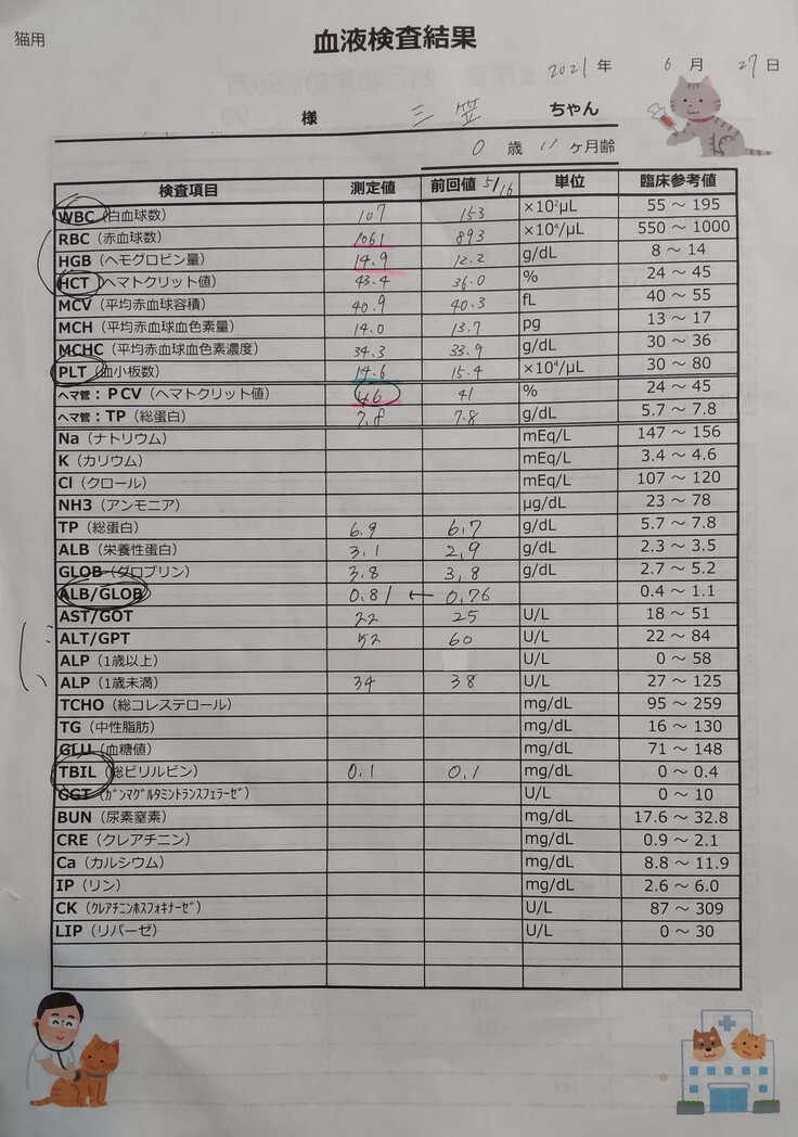 日曜日、経過観察3カ月目の定期診察でした。無事に3カ月の経過観察期間を過ごすことが出来ました。血液検査に異常なく、よい状態を保てているそうです。先生から『がんばりましたね、再発はみられません』というお言葉を頂きました。今後定期的に経過をみていかなければならないので先生は寛解とは仰らなかったのですが、『再発していない良い状態』だということでした。本当にうれしかったです。体重は3.5キロに少しだけ増えました。(^^)