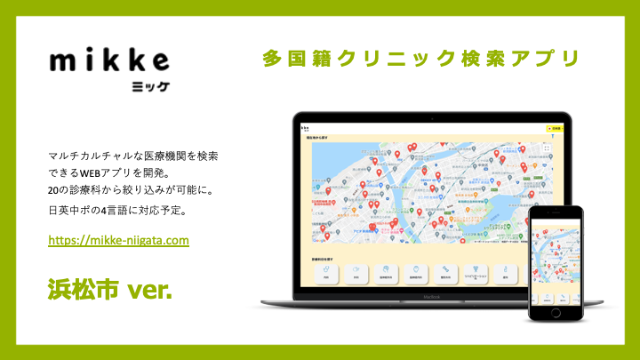 今回のプロジェクトでは、新潟で生まれた多国籍クリニック検索アプリ『mikke』を浜松市版として開発・公開します。