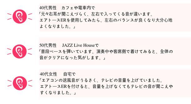 エアトースERを多くの方にお届けして、耳のケアへの関心を高めていく中で、耳が聞こえづらいという方から「使っています」とのお声をいただくことがありました。片方の耳が聞こえにくい方々にとっては、左右で入ってくる音の大きさが異なったり、いろいろな音が全て同じ大きさで聞こえてしまい会話がしづらかったり、と音に対するストレスを抱えていらっしゃることが分かりました。オフィスや日常生活でも困る場面が多く、高価なノイズキャンセラーや補聴器を使っている方々もいらっしゃいます。