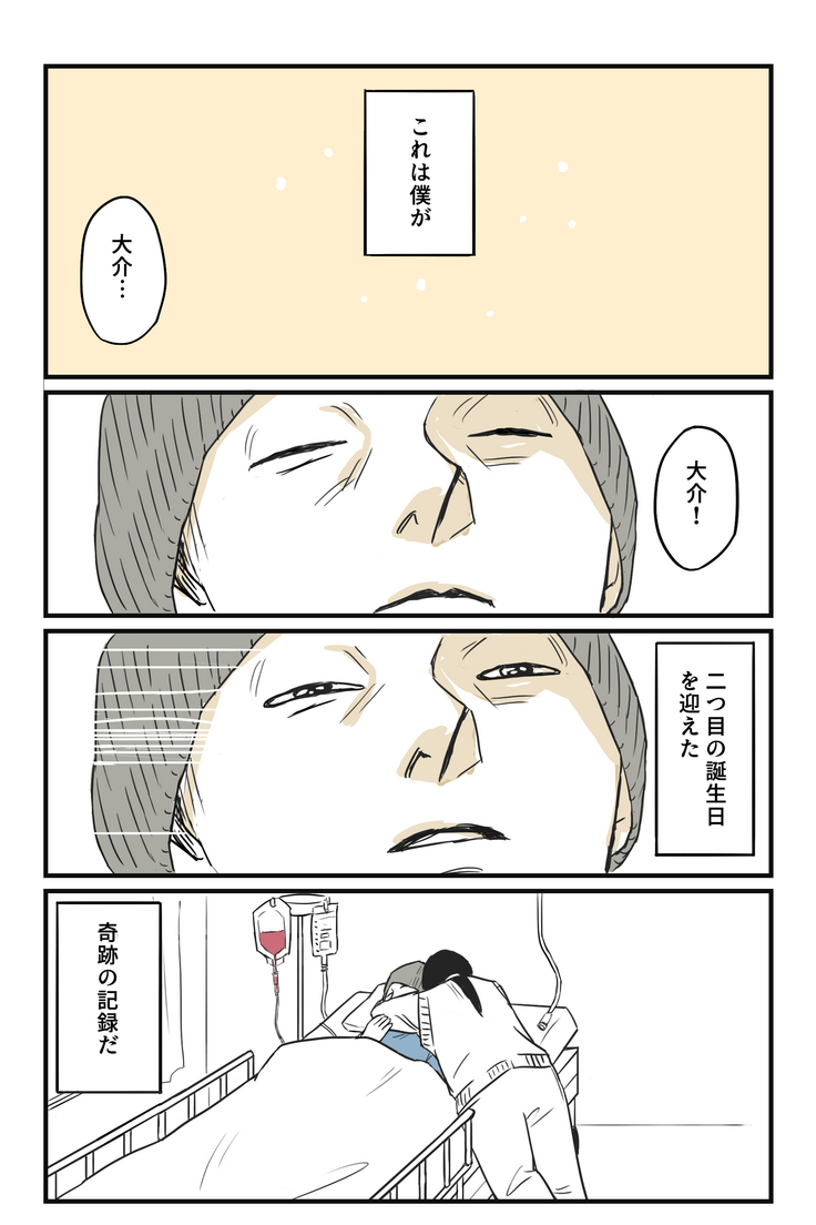 「助かるためには骨髄移植しかない」とドクターは言った……。 大介は子供のころから体を動かすことが好きだった。6歳のころから始めた空手を生かして、今は子供たちに空手を教えている。そんな彼が白血病と診断されたのは25歳の時だった。抗がん剤治療が功を奏し、一時は回復に向かったが、数年後に再発し、ドクターに「助かるためには骨髄移植しかない」と告げられた。