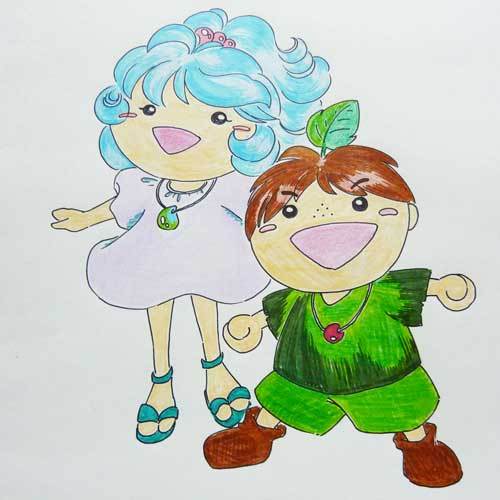 水の精の末っ子『ミナン』はなかよしの木の精の男の子『ポテロ』といつも一緒です。