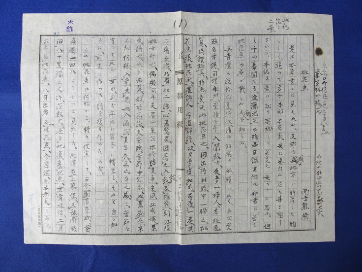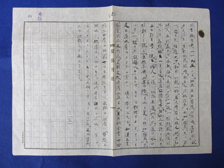 この度、皆様からのご支援によって、南方熊楠が昭和8年(1933)に執筆した原稿の草稿「桃花魚」を購入しました。この原稿は、漢方医薬学ジャーナリズムの先駆者である気賀林一に宛てられており、昭和8年11月1日付封筒に400字詰め原稿用紙2枚が納められていました。