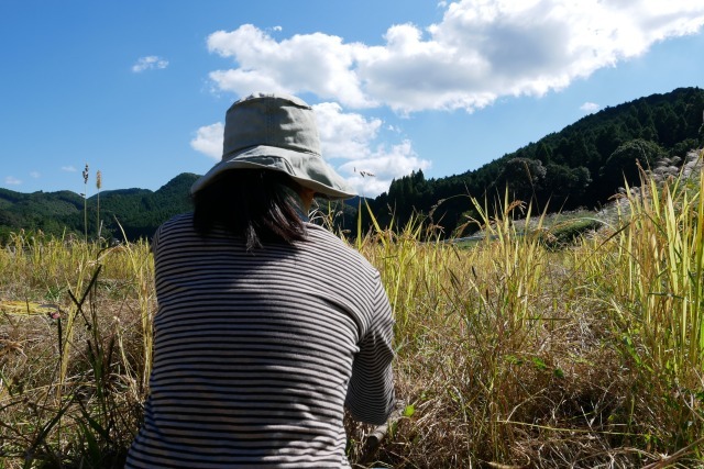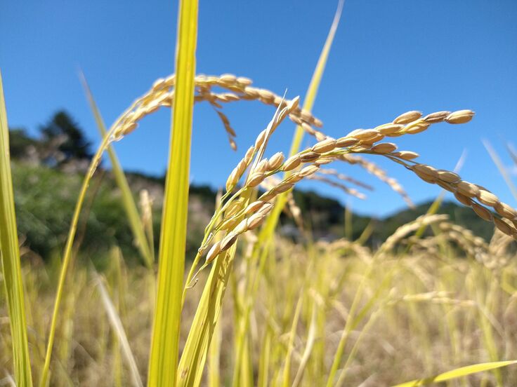 農薬や除草剤、機械を一切使っていない田んぼため、たくさんの虫や生き物たちと一緒に成長をしてきた自然そのものの稲です。