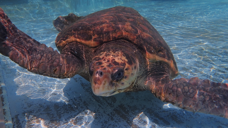 The loggerhead turtle "Hamataro", which is said to have been hatched and bred in 1950 when the Sea Turtle Study Group started its activities, is still kept at Caretta.
