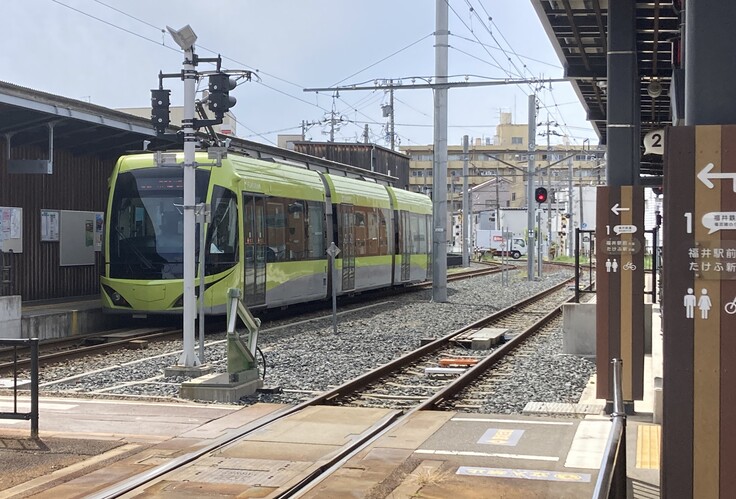 左の1番線に停車した福井鉄道「フクラム」。