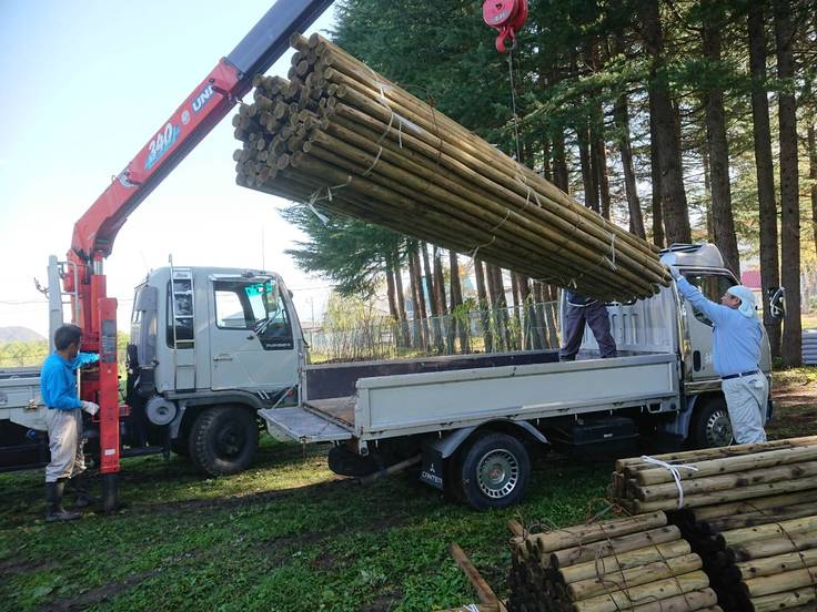 前日の1日、まずは苗100本やそれを支える支柱などを植樹予定地に運ぶ。