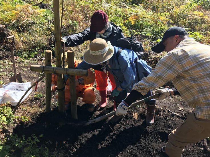 最初の数本は、今年新たに道づくりを行った場所から植えていき、