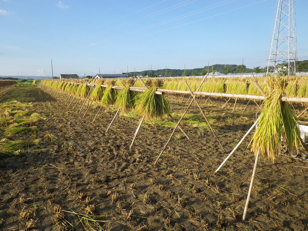 周囲の田はコンバインですでに刈りとりがほとんど終わっているので、わが家のはざ掛けの田が取り残されています。南房総では、このように竹を利用して刈り取った稲を天日乾燥します。