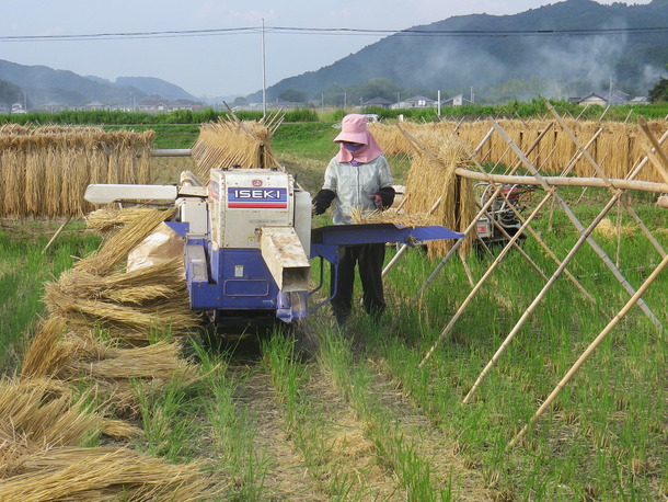 研修生の脱穀作業初挑戦です。脱穀された籾が入る袋の重さは30㎏あります。それを次々と運ばなければならないので大変な作業ですが、農業には体力も必要です。彼女には、ウェイトトレーニングだと思って、腰を痛めないような持ち上げ方をしながら重さに慣れるように言っています。